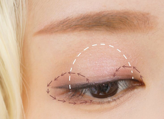 淡粉色眼影铺满眼皮中央,作为眼部打底使用。棕色眼影晕染眼尾眼头。