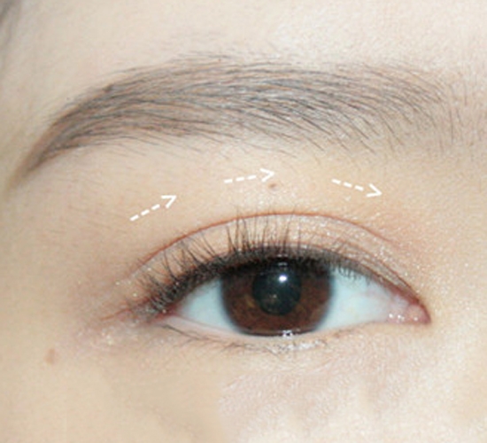 用浅米色眼影给整个上眼皮打底,让眼部看起来更干净无瑕。