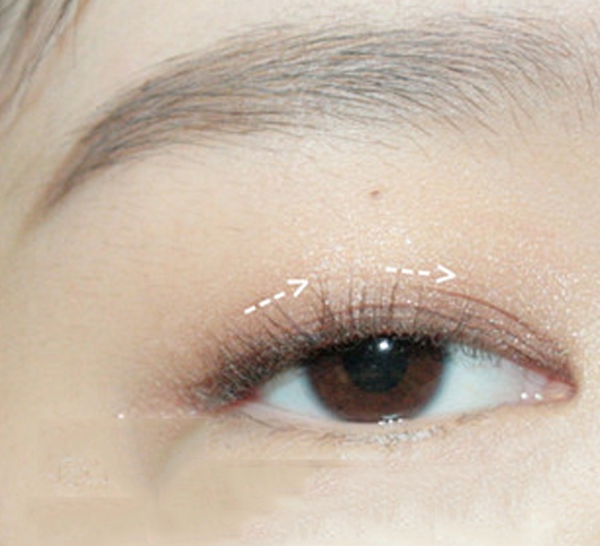用手指沾取眼线色眼影横向描画睫毛根部,并用手指将边缘轻轻向上晕染开。