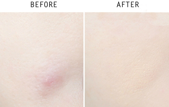 通过对比图可以看见痘痘已经完全被遮盖掉啦,小编遮盖痘痘最简单的秘诀就是尽量维持并展现肌肤状况比较好的地方,遮瑕仅仅用在瑕疵上,保持皮肤原本的质地,底妆才会看起来自然轻薄。
