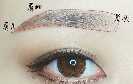 接下来用眉笔勾勒出眉毛的形状,为了看得更清楚,下图标志了眉尾、眉峰、眉头的位置,当然大家也可以根据自己的眉形去调整眉峰的位置。