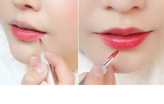 Step4:唇膏/唇彩。在涂唇膏时最好的办法是采用唇刷。如果想让你的嘴唇看起来丰润,可以在涂抹时尽量把唇中部涂得丰厚一些然后再慢慢拉向嘴角,注意嘴角涂得一定要浅而窄,这样唇部看起来就非常的莹润可爱了。不喜欢涂唇膏的人可以只用唇彩就好。