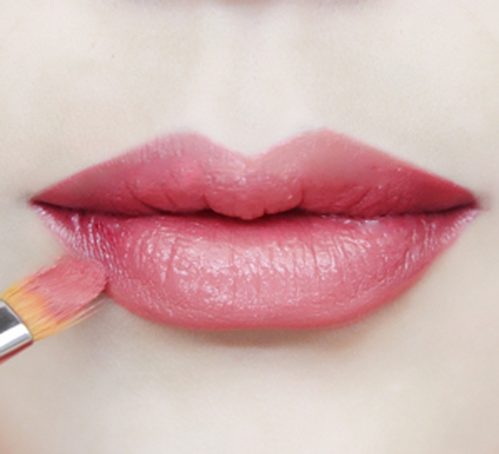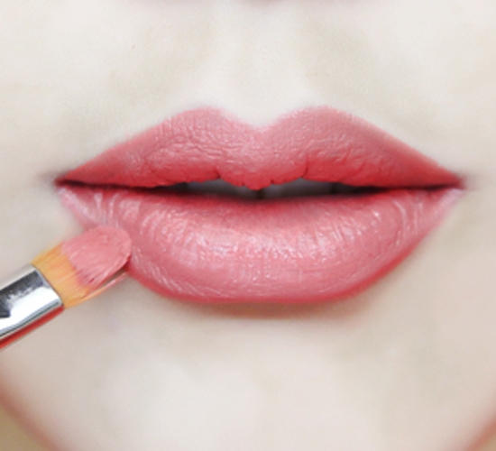 第十四步:使用唇刷将界限变得自然,注意不要让嘴唇中央的珊瑚色变浑。