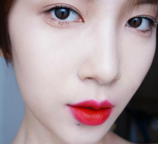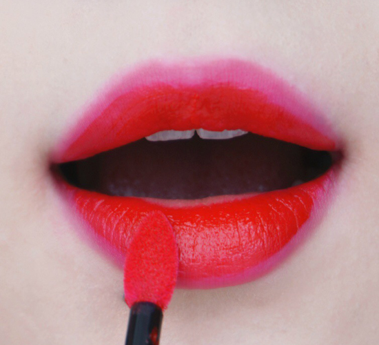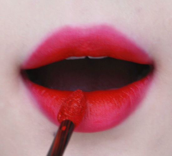 第二步:橘红色口红叠涂在唇部重要,做成渐变唇色,注意两色边缘融合。