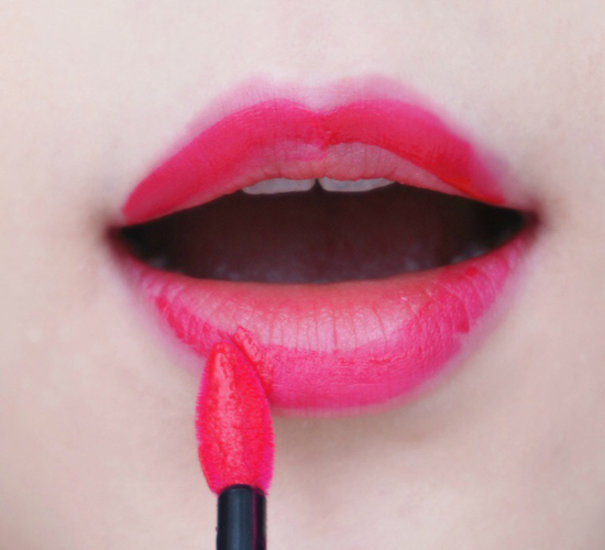 第一步:用遮瑕液将原本唇色遮去,玫红色口红稍微涂一下,不要在意形状,然后用手指晕开,模糊边缘,稍微突出唇部边缘。