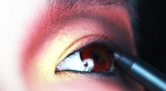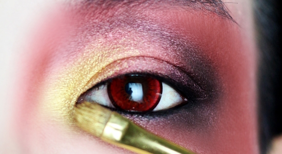 小扁刷沾带珠光的金色,画在内眼角,因为金色上脸不怎么显色,可以把刷子弄湿了再沾眼影,这样会比较显色。