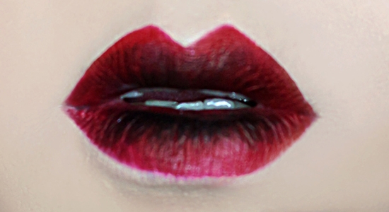 先用红色口红涂抹整个嘴唇打底,眼影刷沾取黑色眼影画出渐变的效果。