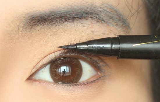 上粉底的时候会沾到睫毛上,让睫毛白白的看起来很不自然,用眼线液把睫毛润一下就好,千万不要涂睫毛膏。