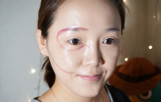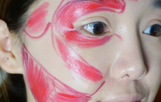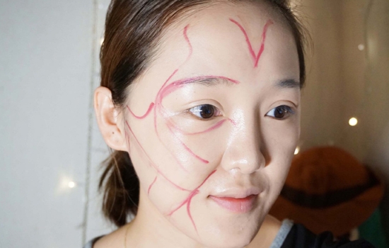 第一步:用细笔刷沾取红色口红勾勒轮廓,因为是要画肌肉走向,开始先把眼睛和嘴巴处的大轮廓勾出来。