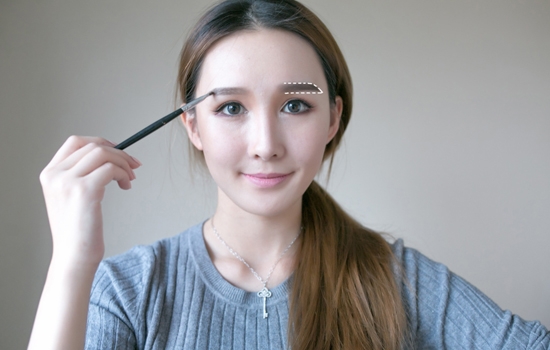 第八步:用眉粉刷眉毛,平眉眉尾向下一点点,虚线的位置,然后用染眉膏刷眉毛,把黑色的眉毛颜色压浅。