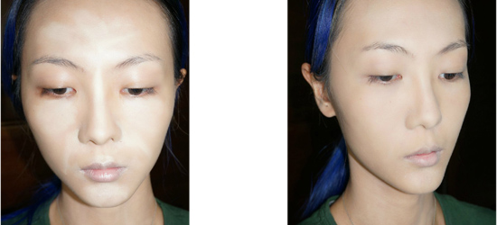第一步:用粉底刷薄透的上一层粉底液之后,用三色遮瑕最浅色涂在需要提亮的地方,使用粉底刷均匀的刷开就好,因为底妆要比较苍白,所以不建议使用带光泽的高光。