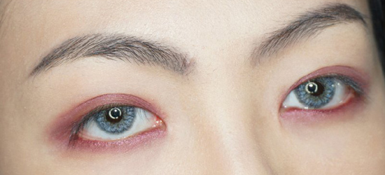 第三步:用酒红色眼影笔涂在双眼皮褶皱内,用火苗晕染刷晕染一下边缘,下眼影也要晕染到位哦。