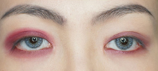 第四步:用稍大一点的刷子沾取红色眼影继续往上晕染,面积左右对比一下,大概范围可以参照图中所示。