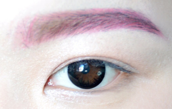 第一步:用浅紫色眼影打出眉毛的大致形状,然后用深紫色眼影加重眉尾,眉毛尽量平直,可以营造好感哦。