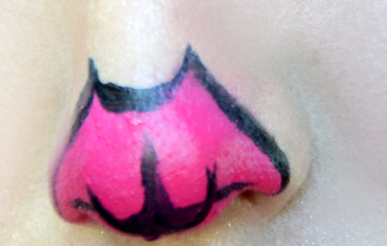第十步:用油彩盒的玫瑰红色画出鹿鼻子,然后用黑色眼线笔勾勒形状。