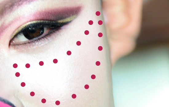 第十一步:粉色腮红轻轻扫在图标的位置,然后再用气垫粉底薄盖一层,就会有很自然的好气色啦。