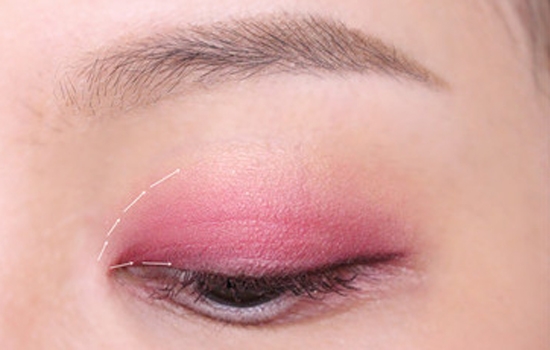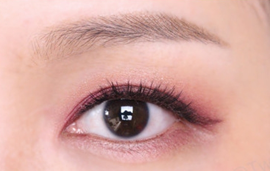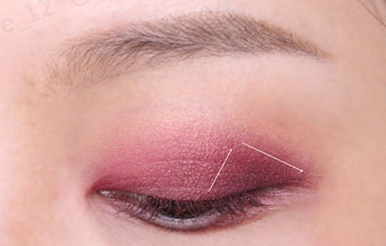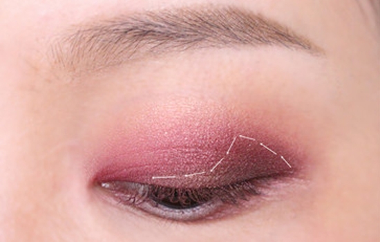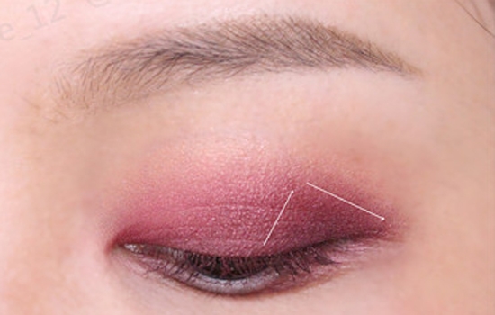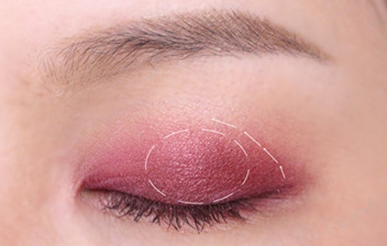 第一步:用深玫瑰色眼影铺满眼头前三角,范围可以稍微大一些,具体范围如图所示。