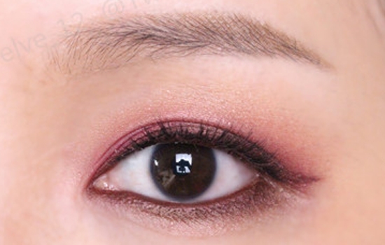 第七步:用酒红棕色眼线胶笔画下内眼线,再用灰棕色眼影铺满下眼影。