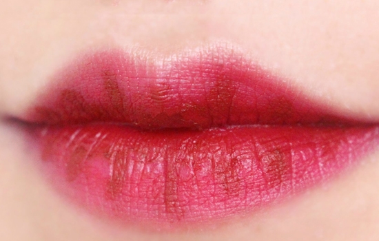第八步:玫瑰色口红在嘴唇上全涂,用酒红色眼线胶笔在嘴唇上画出一根根的纹路。