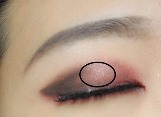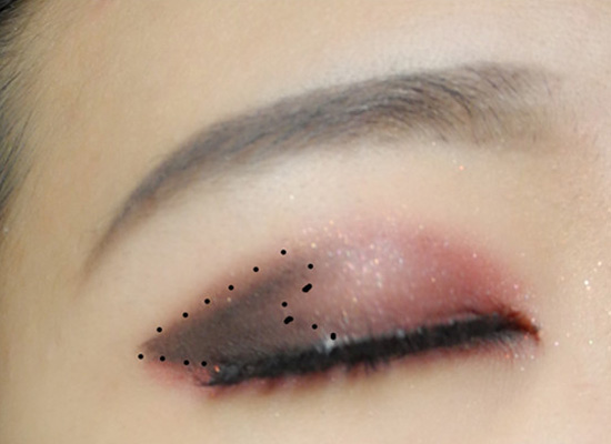 第三步:用黑色哑光眼影在眼尾画一个三角,并晕染自然,三角形状可如图所示。