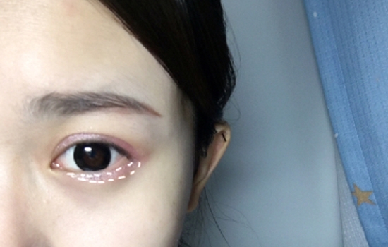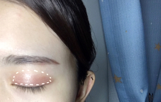 上一步使用的刷子上的粉色眼影余粉,画在如图的位置。