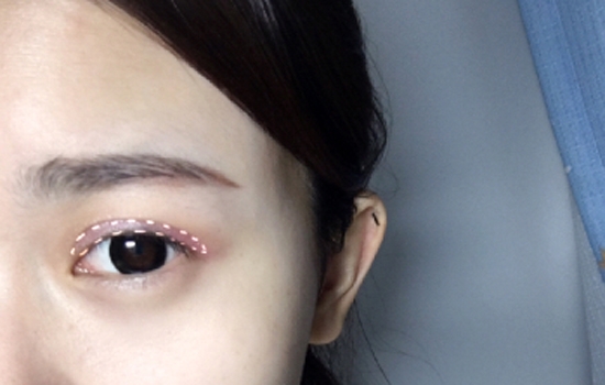 深一色号的粉色眼影画在靠近睫毛处,双眼皮褶皱内。