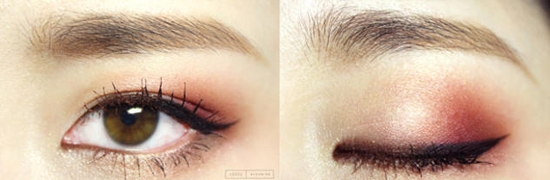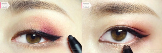STEP12:用带金色珠光的棕色眼线笔画上眼线,只画前半根。