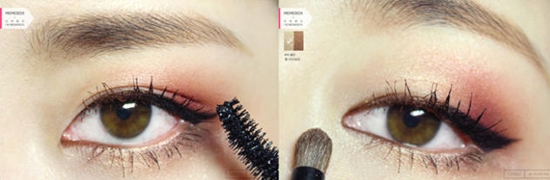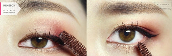 STEP16:夹翘睫毛后,给上、下睫毛仔细刷上棕色睫毛膏,都只刷前半部分。