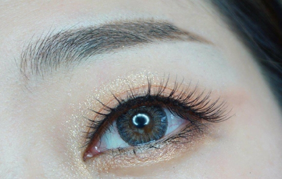 夹翘睫毛后,戴上自然纤长型的假睫毛,用睫毛膏将上下睫毛刷好即可。