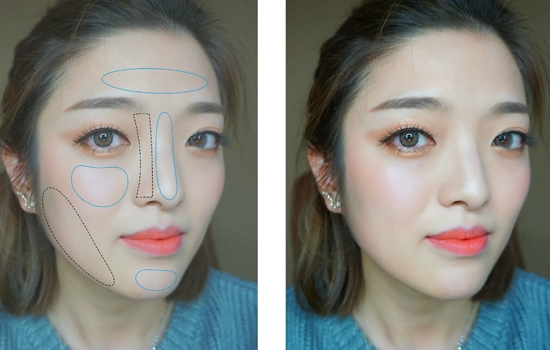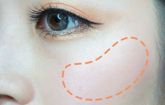 粉橘色腮红用腮红刷沾取,轻轻打在如图所示的位置。