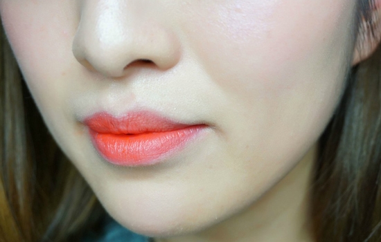 唇部磨砂后,先用润唇膏涂抹嘴唇,十分钟后用纸巾抿去唇部的油分,再用暖橘色唇彩涂满嘴唇。