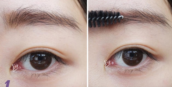 STEP1:戴上美瞳后,用深棕色眉笔描画一字眉,然后用眉刷整理一下眉形。