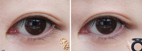 STEP2:用适量淡黄色眼影涂抹在眼周,提亮眼周肤色。取适量哑光裸色眼影涂抹在整个眼窝。