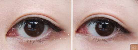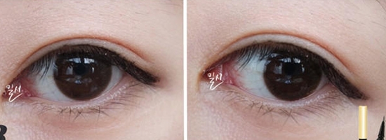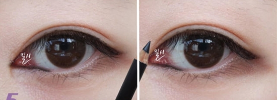 STEP5:用黑色眼线笔沿着粘膜从眼头开始描画眼线,描画至三分之一处即可。