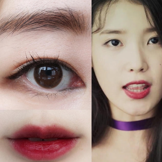 本次IU仿妆主要有两大特点,一个是眼线尾部稍微向下描画,下眼睑三角处晕染范围稍微扩大;另一个就是深红色唇妆。