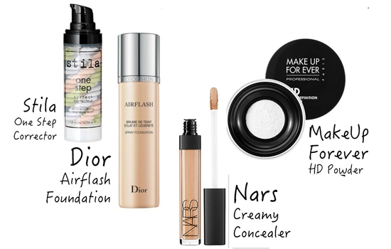 STILA ONE STEPCORRECTOR、MAKE UP FOREVERHD POWDER、DIOR AIRFLASHFOUNDATION、NARS CRERMYCONCEALER。