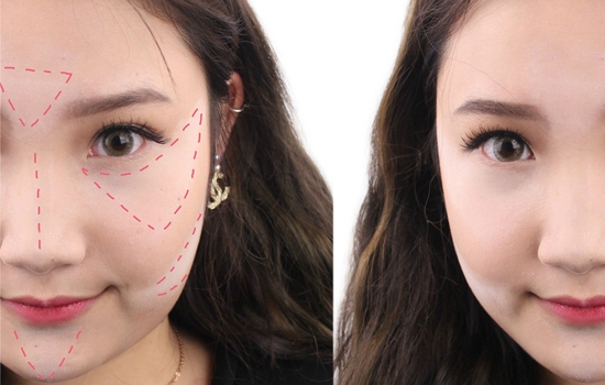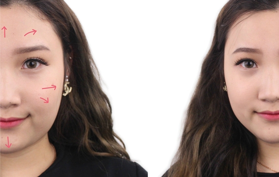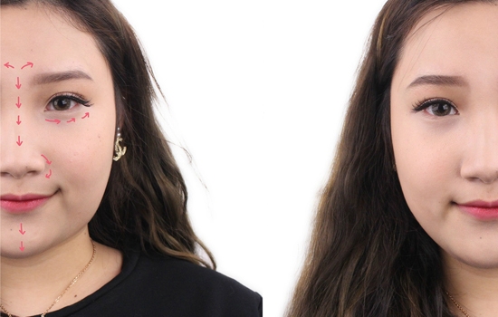 第二步:遮瑕的主要涂抹部位在眼下、鼻翼两侧泛红皮肤的部位。鼻梁、额头和下巴可以选择性涂抹遮瑕膏作为高光,可以让五官看起来更加立体,并按箭头方向涂抹均匀。