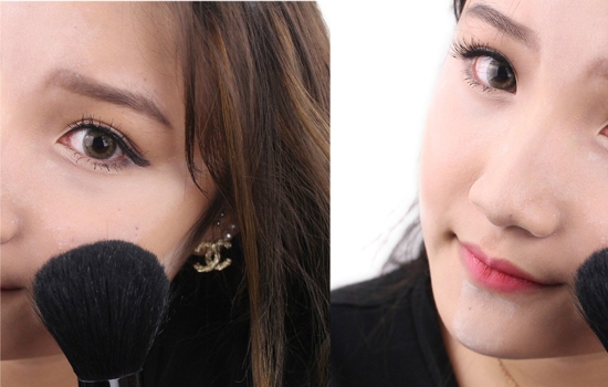 第四步:在等待的时候可以画好眼下部位的妆容,用蓬松的大刷子晕开散粉,从散粉集中最多的位置往外扫,打圈后慢慢覆盖至全脸。