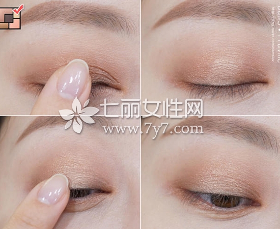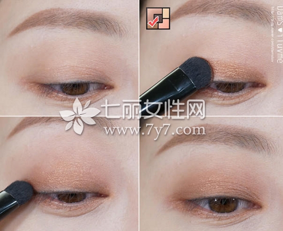 STEP3:用微光杏色眼影涂抹在双眼皮处,和打底眼影实现自然晕染效果。