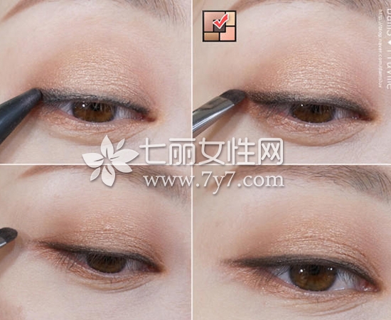 STEP5:用黑色眼线笔描画眼线,然后用平角粉刷战蘸取适量深棕色眼影,晕染眼线。