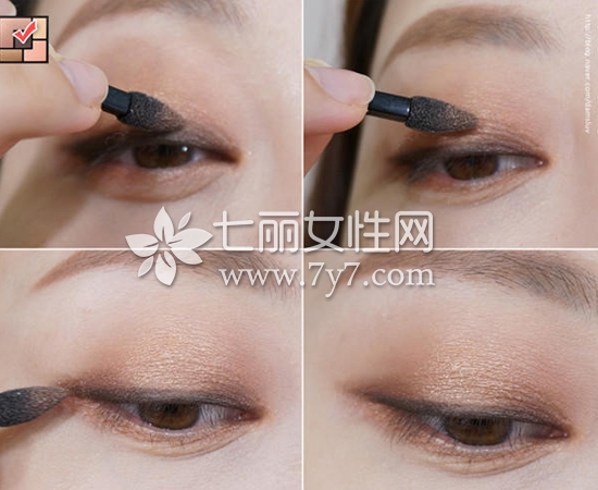 STEP6:用眼影盘里赠送的海绵头粉刷蘸取适量深棕色眼影,由眼头涂抹至眼尾,区域正好双眼皮眼褶处。