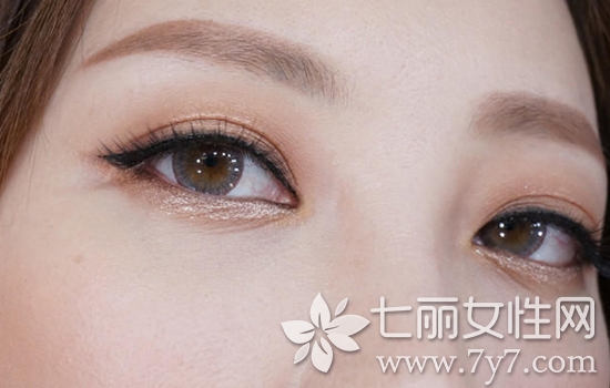STEP7:用棕色眼线笔描画下眼线,粘贴假睫毛。用粉刷蘸取适量金属色闪亮眼影从眼头开始涂抹至下眼睑三分之一部位,增加眼妆亮点。
