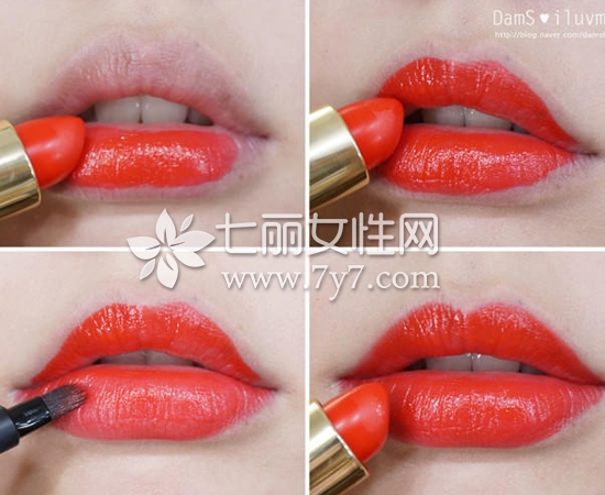 STEP10:用鲜红色唇膏先涂满下唇,然后再涂抹上唇内侧,最后用唇刷匀散开,打造丰满、亮丽唇妆。