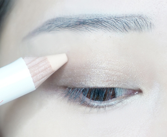第四步:使用比肤色浅一色号的高光笔画在眉骨的位置,且用手指指腹将边缘晕染自然。