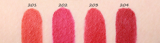 本次试色的是201/202/203/204色,涂在手臂上可以看得出这款口红质地顺滑,滋润,在闪光灯下带有细微闪光感。