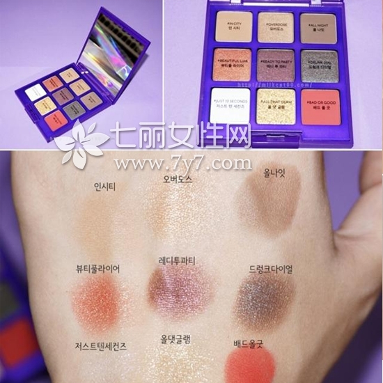 神秘紫色包装的9色眼影盘,从日常多用的棕色系到出跳的亮色都包含在内,珠光感居多,粉质细腻,不容易浮粉。