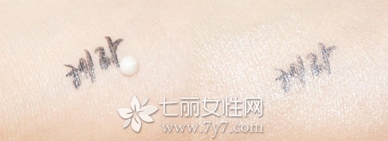 与其他公司的妆前乳进行了一下色彩比较,顺序分别是B公司、赫拉、M公司的妆前乳。赫拉妆前乳颜色比其他两个公司的产品要亮一些。