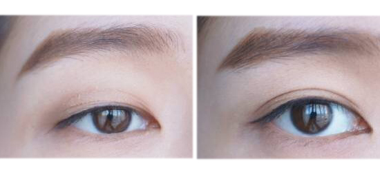 第一步:三色眉粉的中间色与深色混合,在眉毛上画出大概眉形,且眉峰要突出,画出鹿晗的那种英气眉。DOLLWLNK棕色眼线液笔,用棕色眼线液笔勾勒出前后眉毛的生长走向,增加眉量。