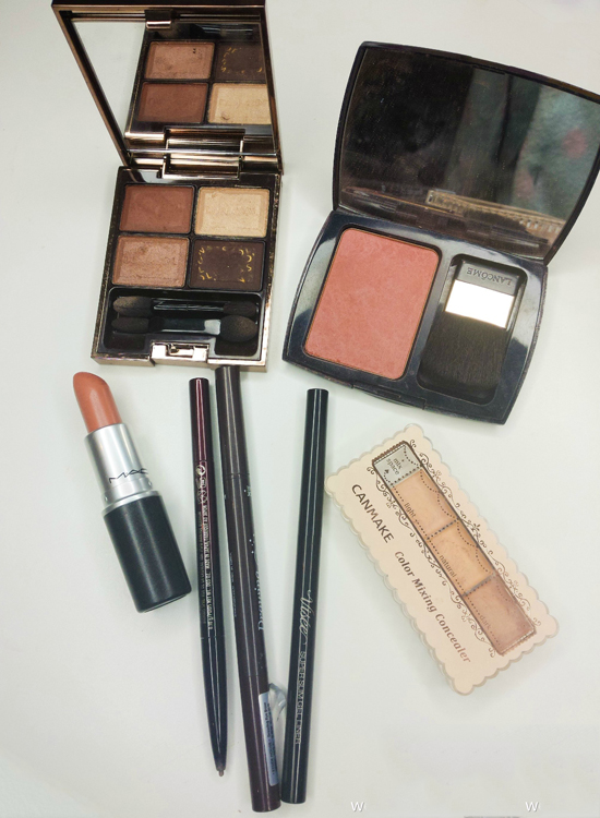 LUNASOL秋季媚惑巧克力四色眼影、canmake三色遮瑕膏、MAC子弹头口红、伊蒂之屋眉笔01茶褐色、准备自己常用的眼线笔、腮红即可。