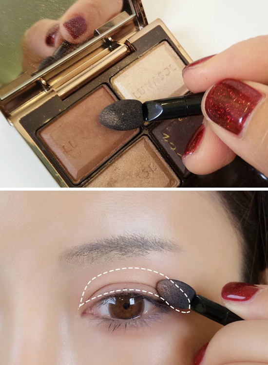 第二步:使用LUNASOL秋季媚惑巧克力四色眼影02色,先选取基础无光咖啡色铺在整个眼皮,下眼睑也要从后向前铺开并达到整体性。